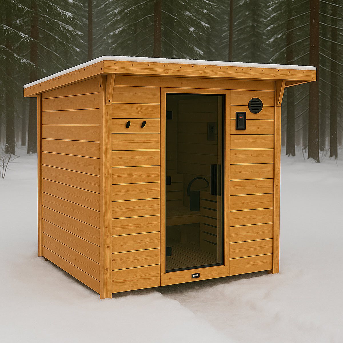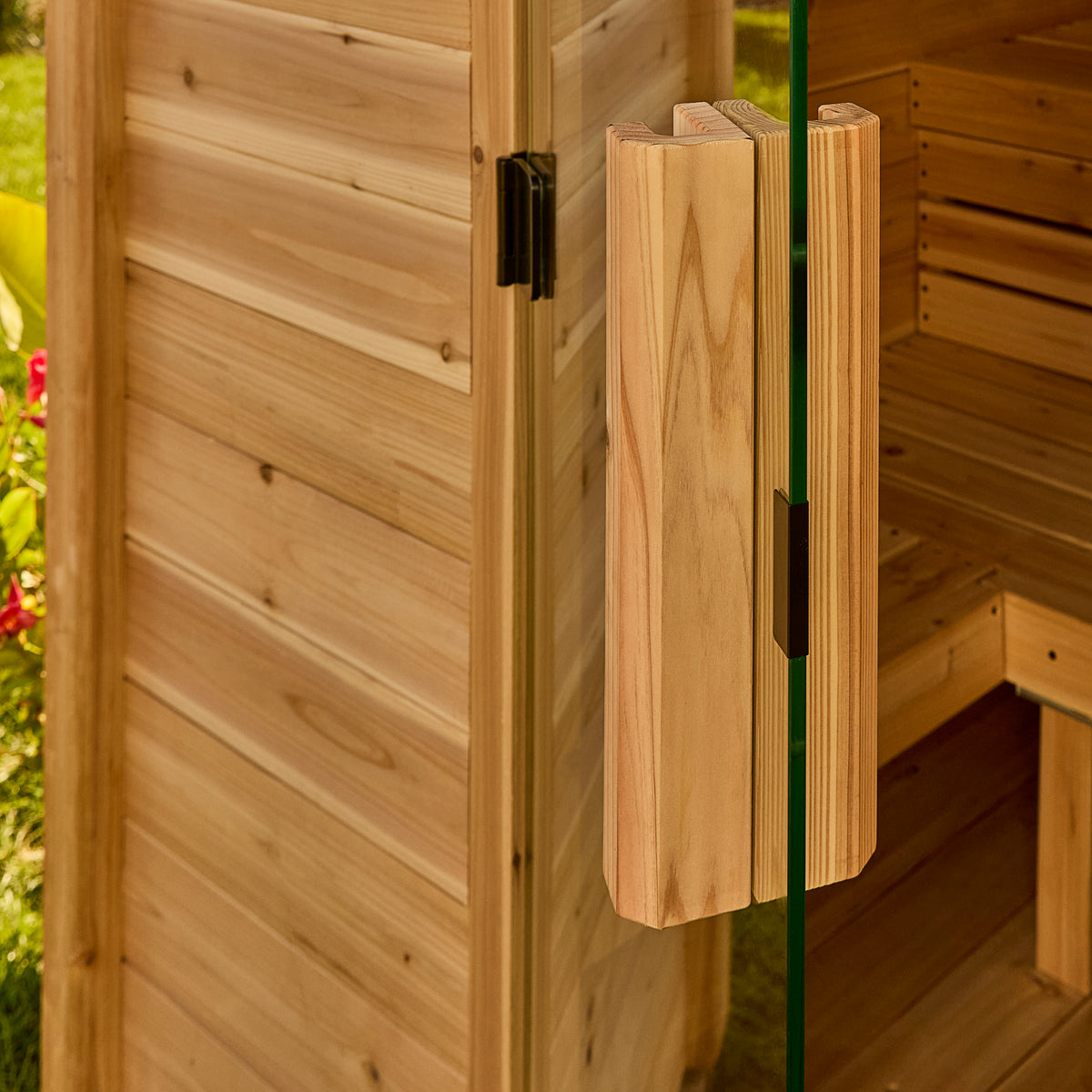 The contemporary Lennon Cube Sauna gives you more room inside, built with tongue-and-groove cedar construction and a powder-coated galvanized steel roof that handles every season.